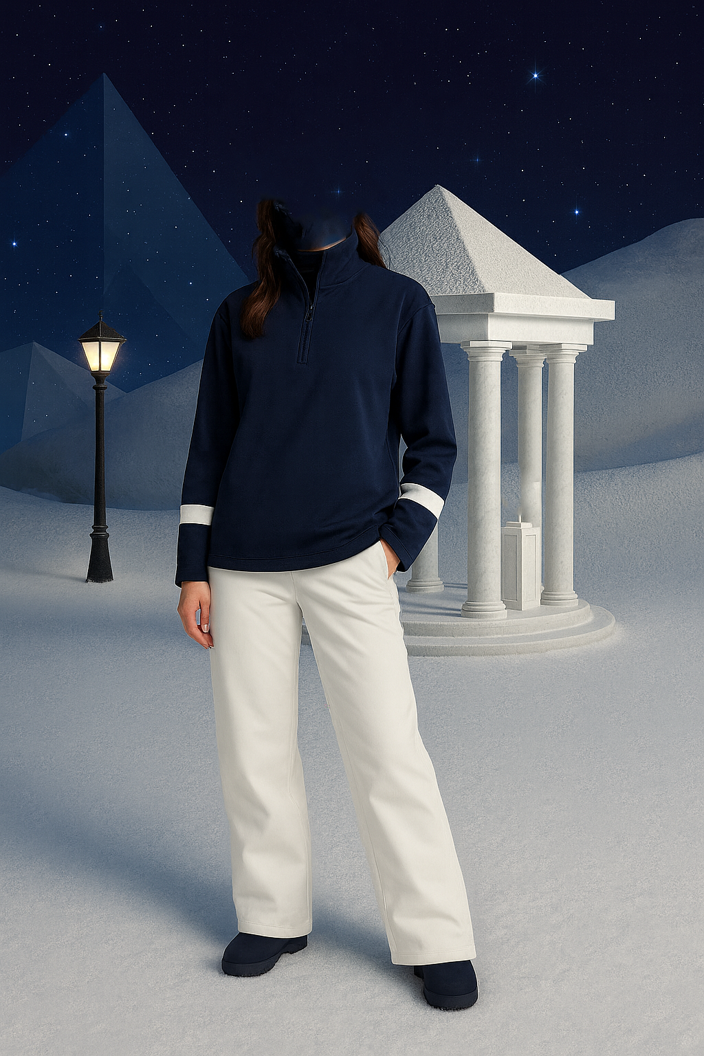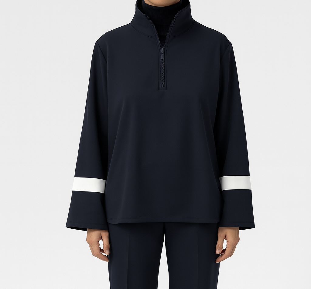 این بلوز نیمزیپ را میتوان با شلوارهای ساده در طیف روشن یا تیره هماهنگ کرد تا استایلی ماندگار و مینیمال شکل بگیرد.